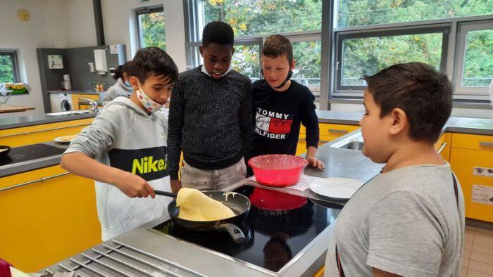 Die Kinder unserer 5. Klassen bereiten ein Mal wöchentlich etwas Köstliches in der Küche zu. Zum Beispiel gab es schon ein deftiges Frühstück mit Rührei oder Spiegelei, einen Obstsalat mit Joghurt und Nüssen oder in der Weihnachtszeit wunderbare Plätzchen. Den Kindern macht das Zubereiten große Freude.