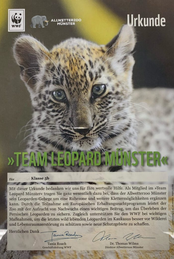 Im Oktober 2020 besuchten die Klassen 5a und 5b der Hauptschule Coerde den Allwetterzoo in Münster. Die Schülerinnen und Schüler waren fasziniert von der Artenvielfalt im Zoo und besonders begeistert von den Leoparden. In einem anschließenden Klassengespräch entwickelten wir Ideen, wie wir einen Beitrag zum Artenschutz leisten können. Gemeinsam entschlossen wir uns für eine Tierpatenschaft. Seit Januar 2021 gehören wir dem „Team Leopard Münster“ an und unterstützen gerne den Allwetterzoo und den WWF mit einem finanziellen Beitrag aus der Klassenkasse.